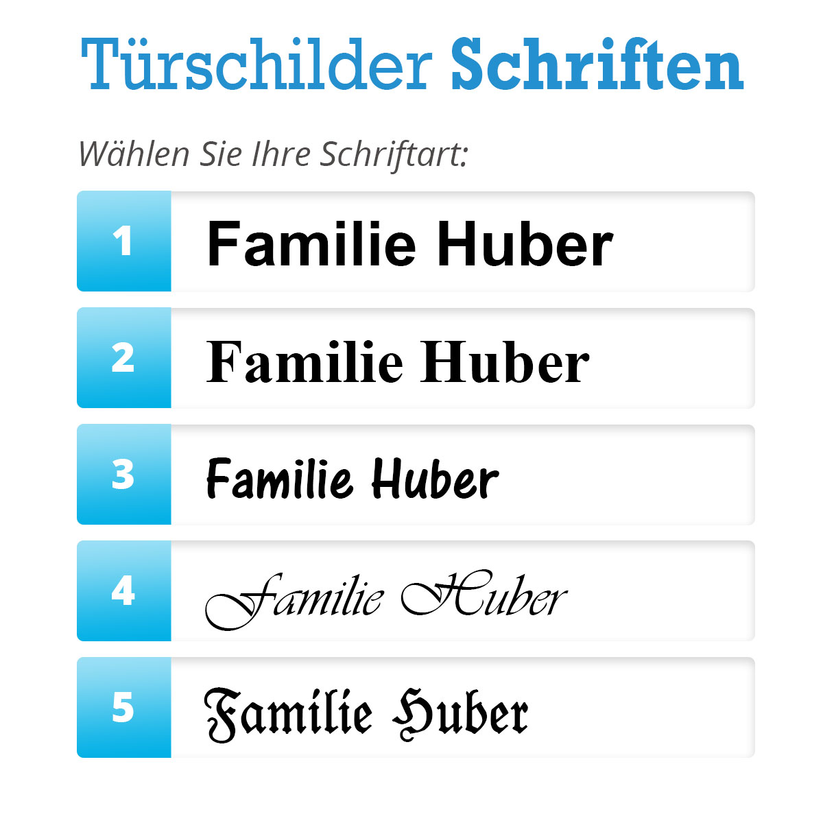 Schriftfarbe in Scharz, Weiß, ohne Füllfarbe (natur) oder RAL-Farbe nach Wunsch möglich.