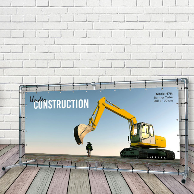 Eine robuste Außenbannersystem aus kräftige 3 mm / Ø 48 mm Aluminium Röhre. Freistähender Wand mit Füße für Präsentation von PVC-Banners im Großformat.